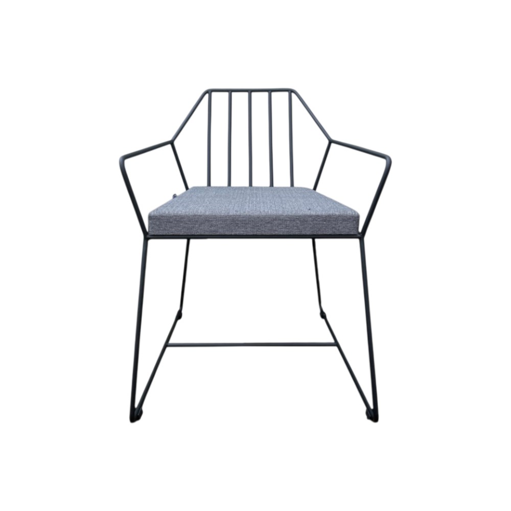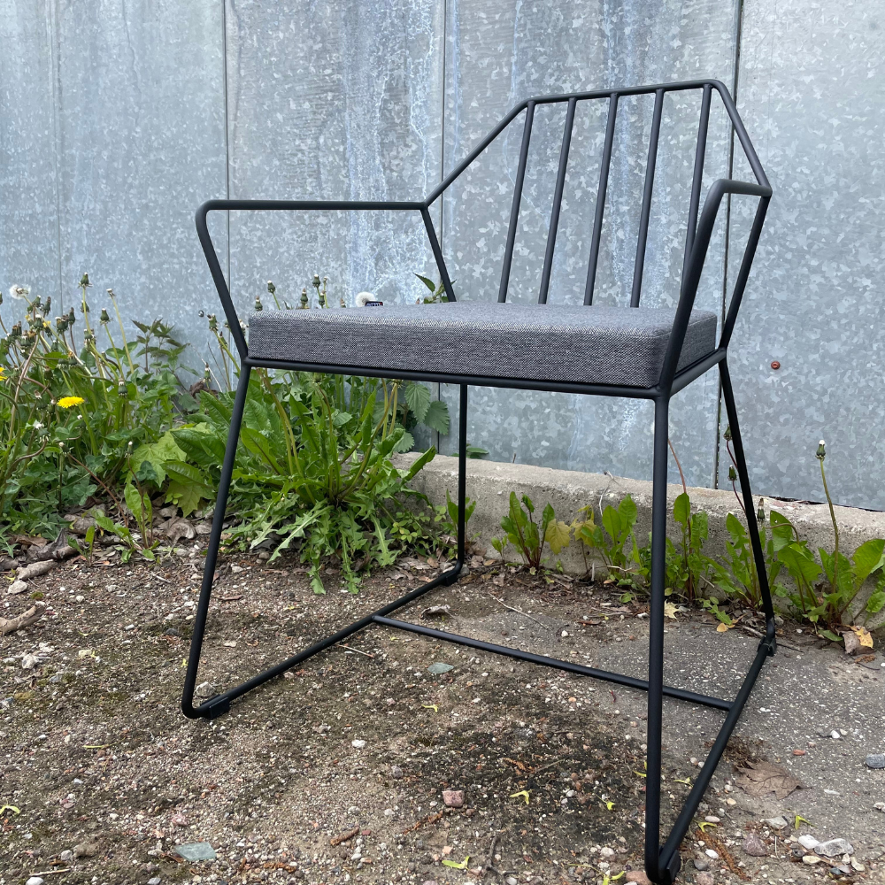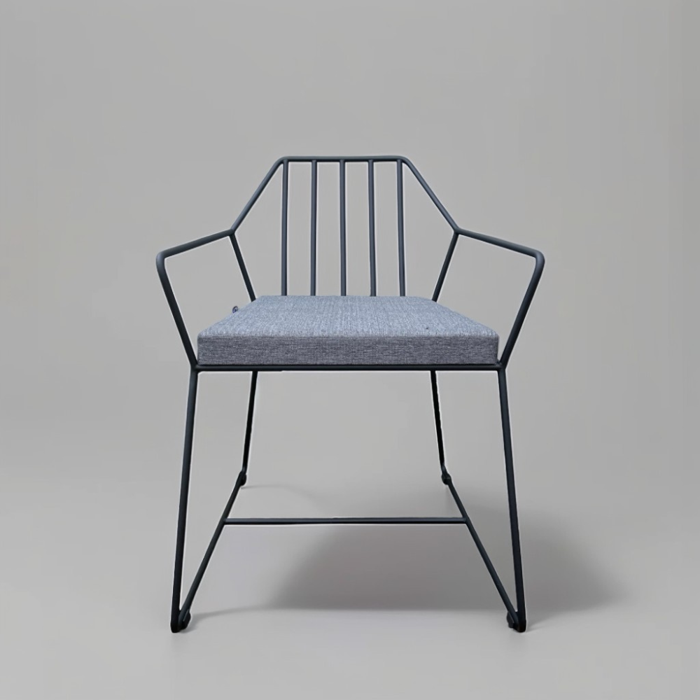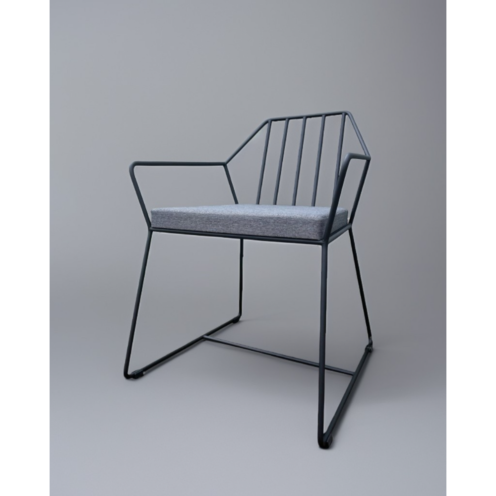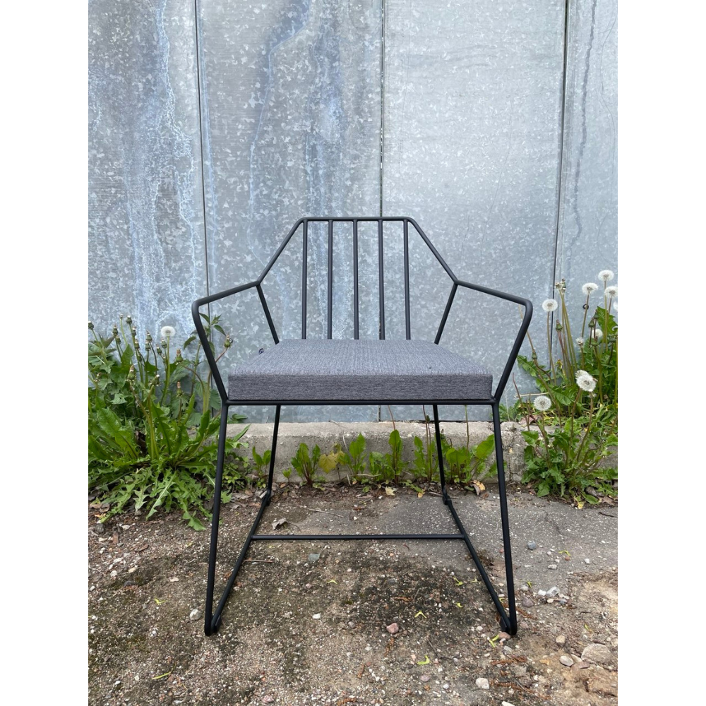 Спинка и сидение выполнены из металлических прутьев. Надежный металлический каркас всего кресло окрашен порошковой краской, устойчивой к механическому воздействию цвета «черный муар».