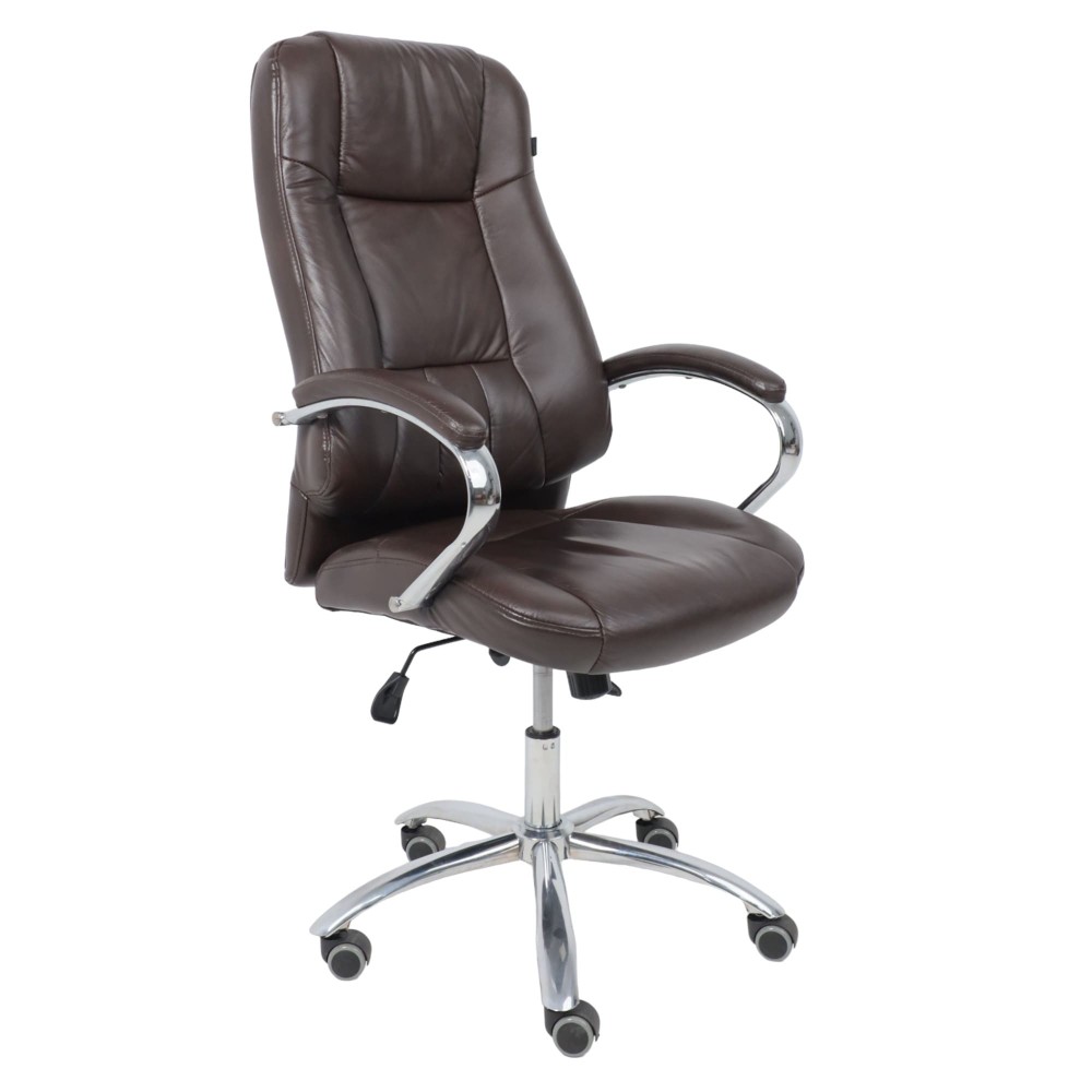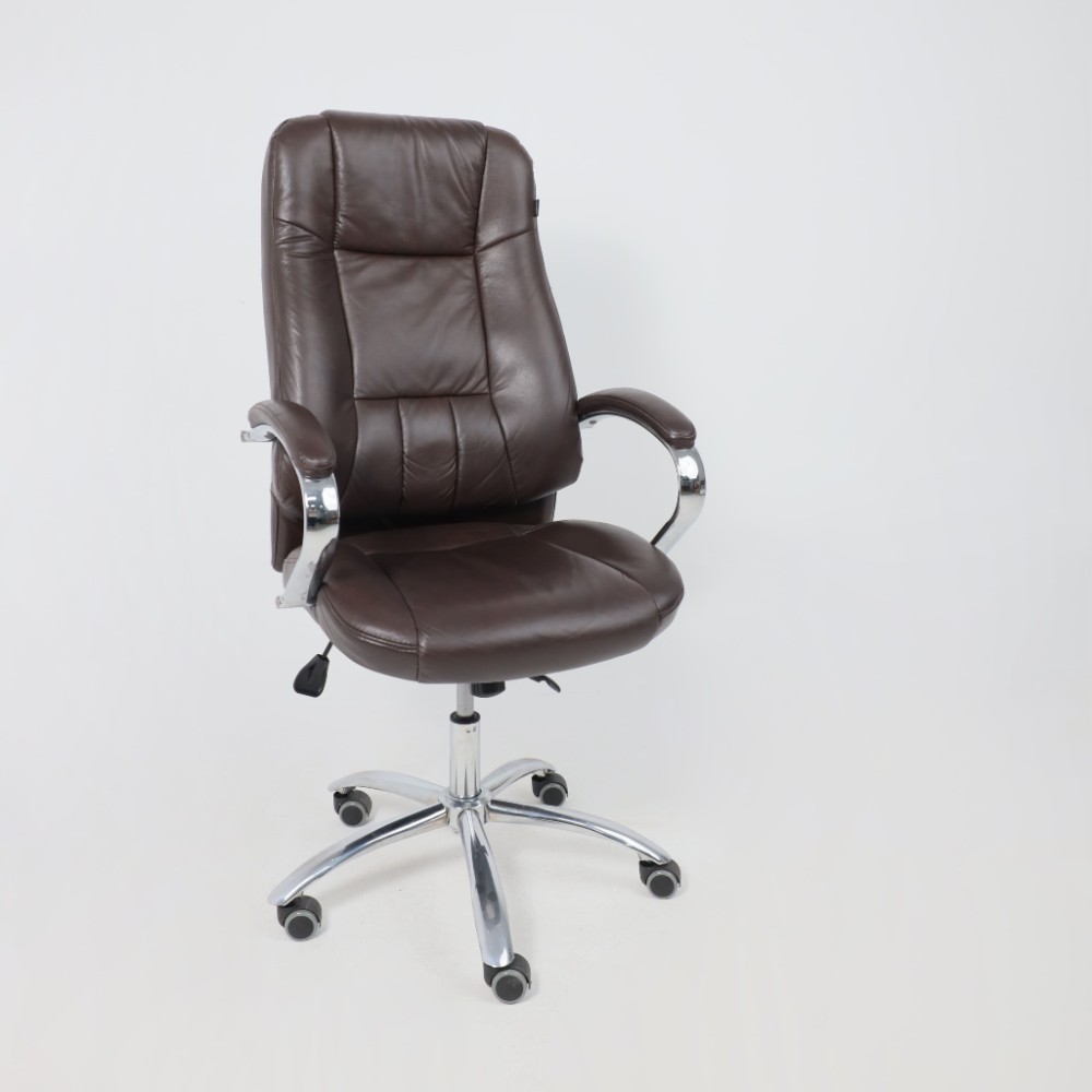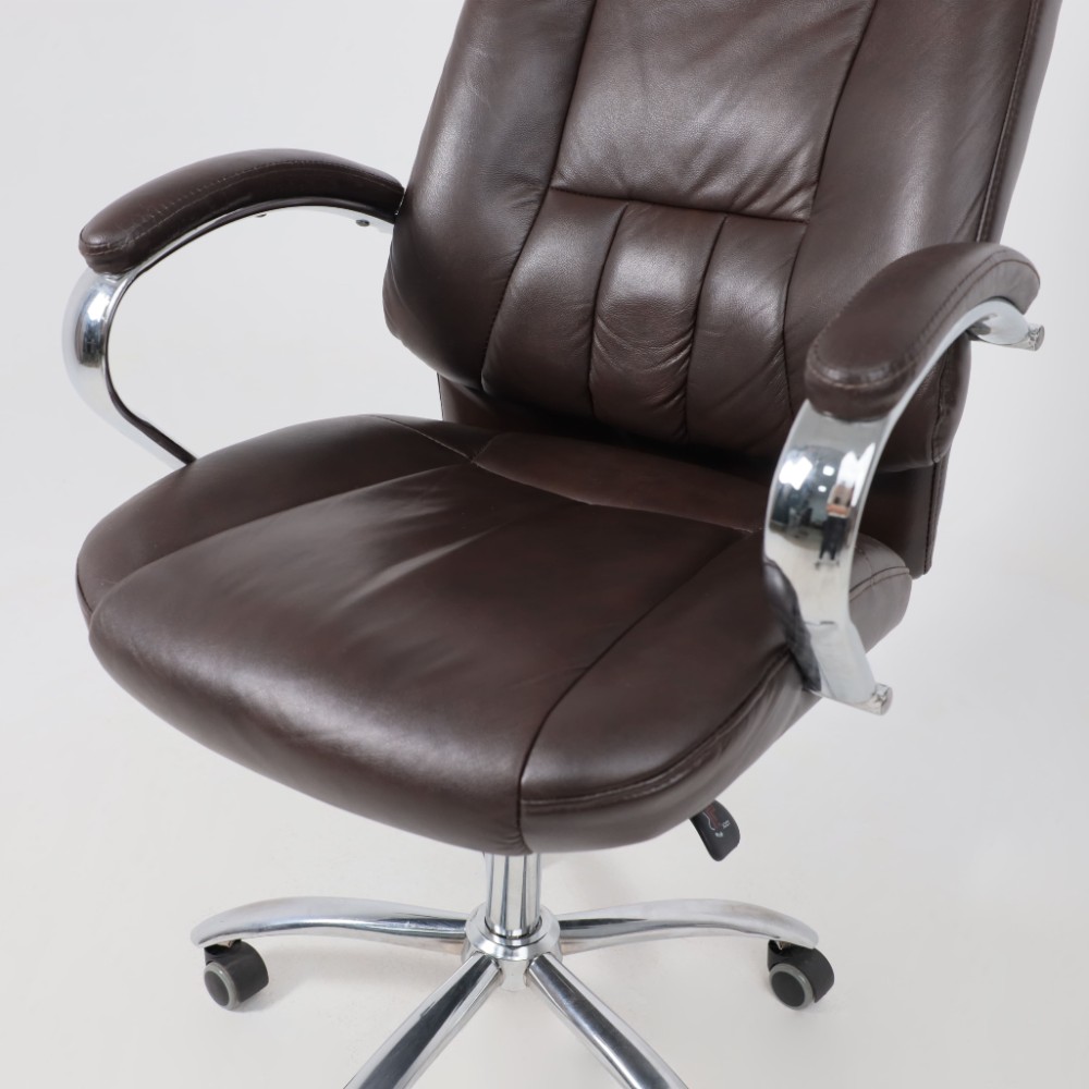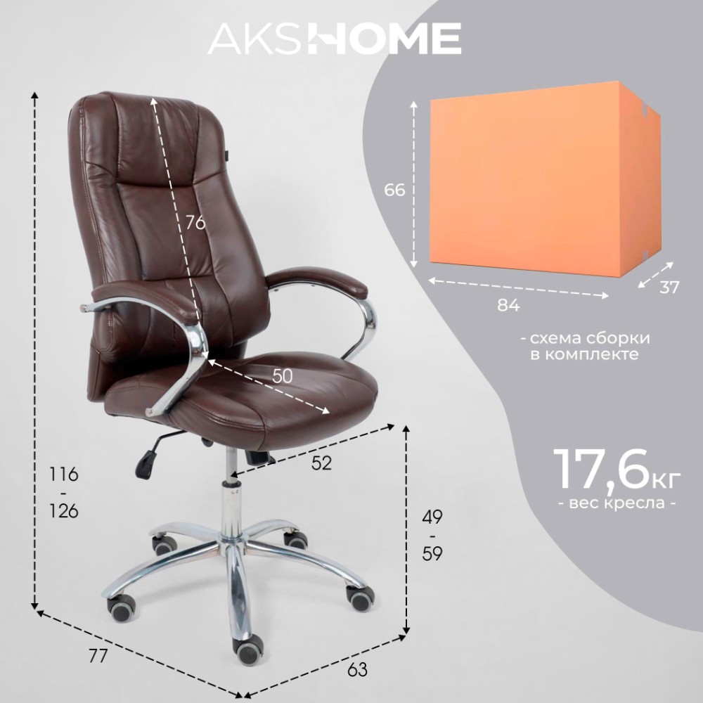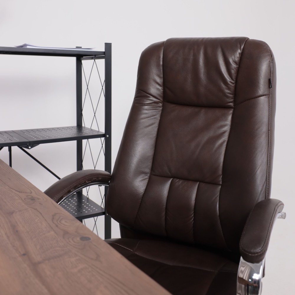 Материал презентабельно выглядит и подчеркивает статус владельца. Кресло мягкое, с увеличенной зоной подголовника и выступающими подушками, предотвращающими нагрузки на шею, спину и ноги. Высота сиденья настраивается исходя из индивидуальных параметров владельца. Модель оснащена механизмом качания Anyfix, позволяющим фиксировать угол наклона кресла в разных положениях и регулировать жесткость качания в зависимости от веса пользователя. Дополнительный комфорт обеспечивают хромированные подлокотники с мягкими накладками из кожи. Установлены газлифт 3 класса, металлическая хромированная крестовина и прорезиненные ролики. Изделие выдерживает нагрузку до 150 кг.