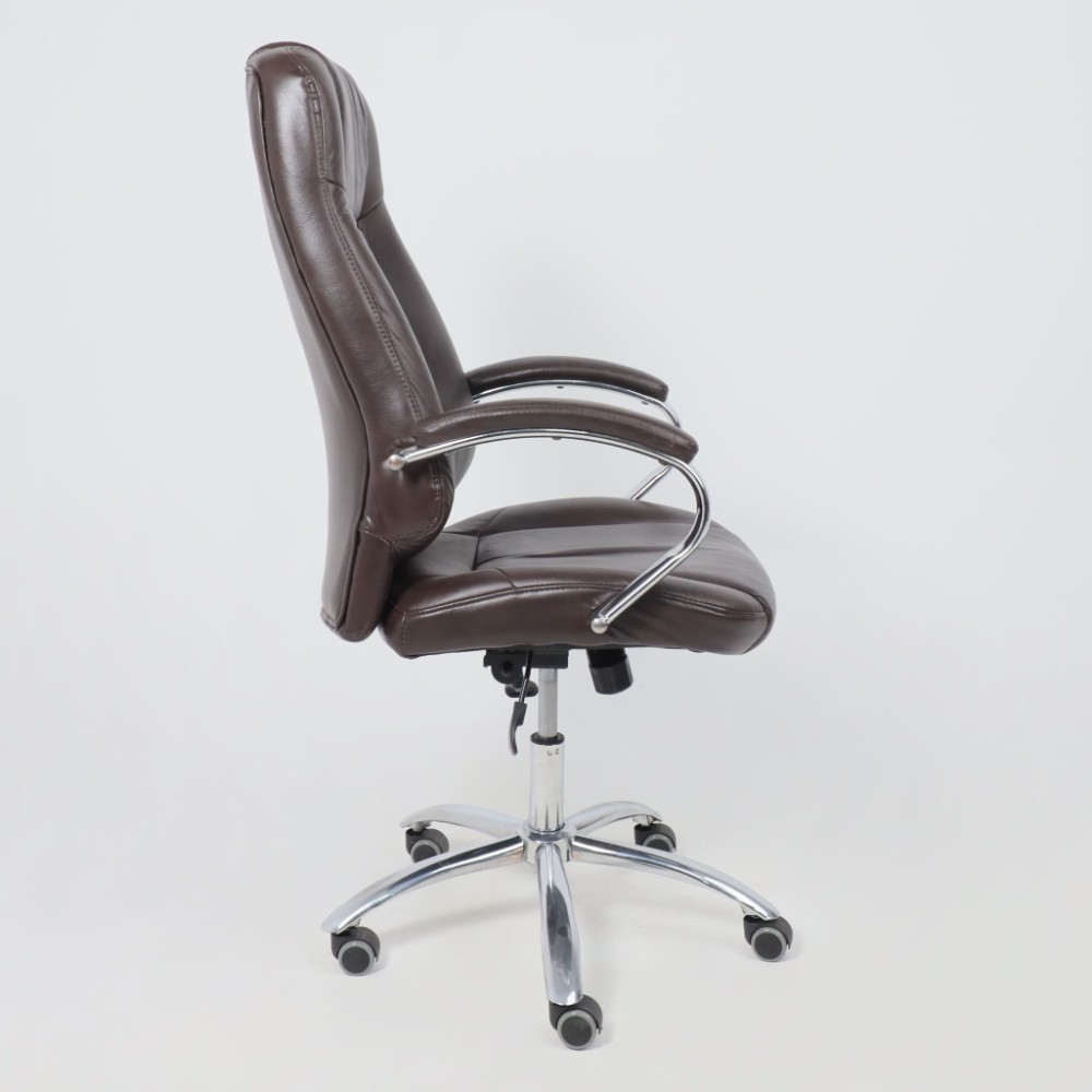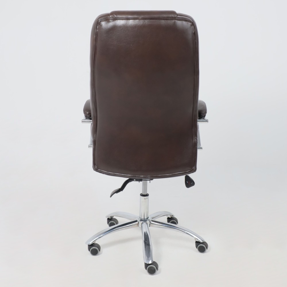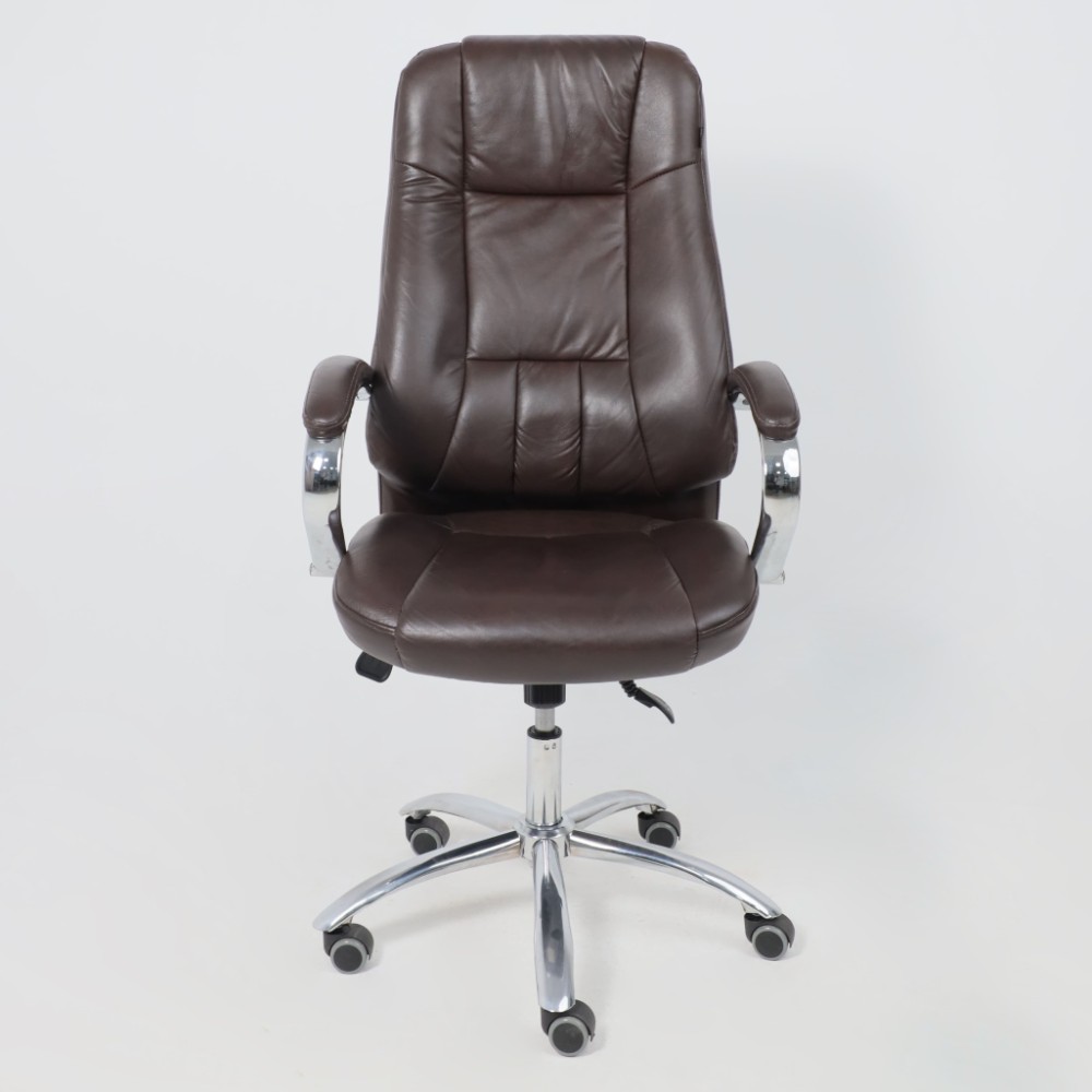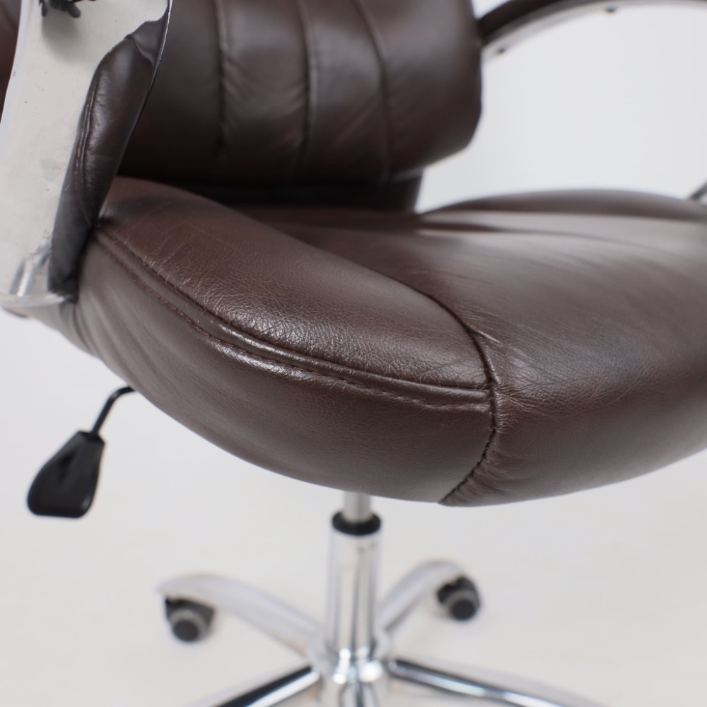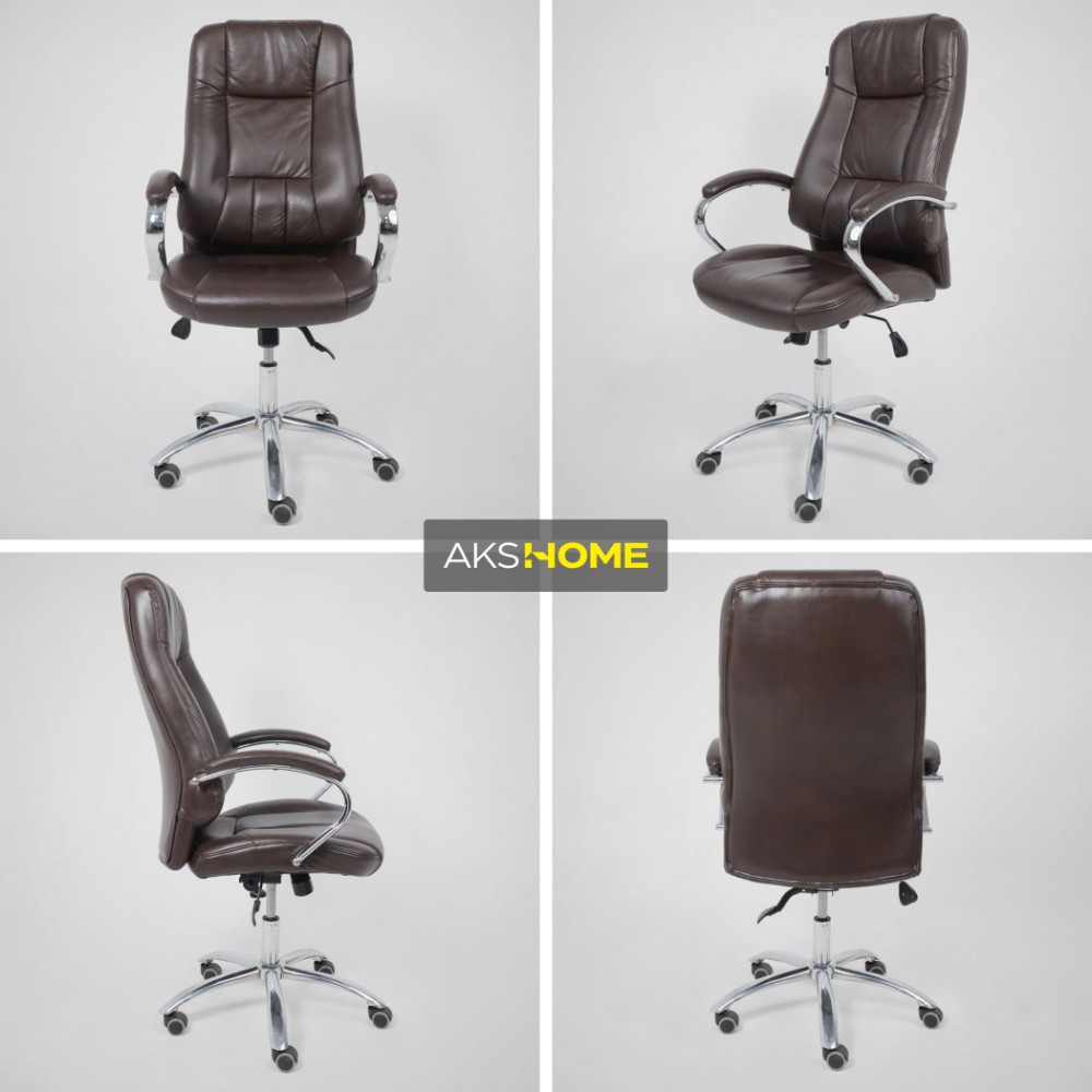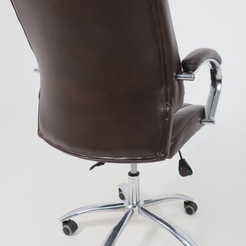 Материал презентабельно выглядит и подчеркивает статус владельца. Кресло мягкое, с увеличенной зоной подголовника и выступающими подушками, предотвращающими нагрузки на шею, спину и ноги. Высота сиденья настраивается исходя из индивидуальных параметров владельца. Модель оснащена механизмом качания Anyfix, позволяющим фиксировать угол наклона кресла в разных положениях и регулировать жесткость качания в зависимости от веса пользователя. Дополнительный комфорт обеспечивают хромированные подлокотники с мягкими накладками из кожи. Установлены газлифт 3 класса, металлическая хромированная крестовина и прорезиненные ролики. Изделие выдерживает нагрузку до 150 кг.