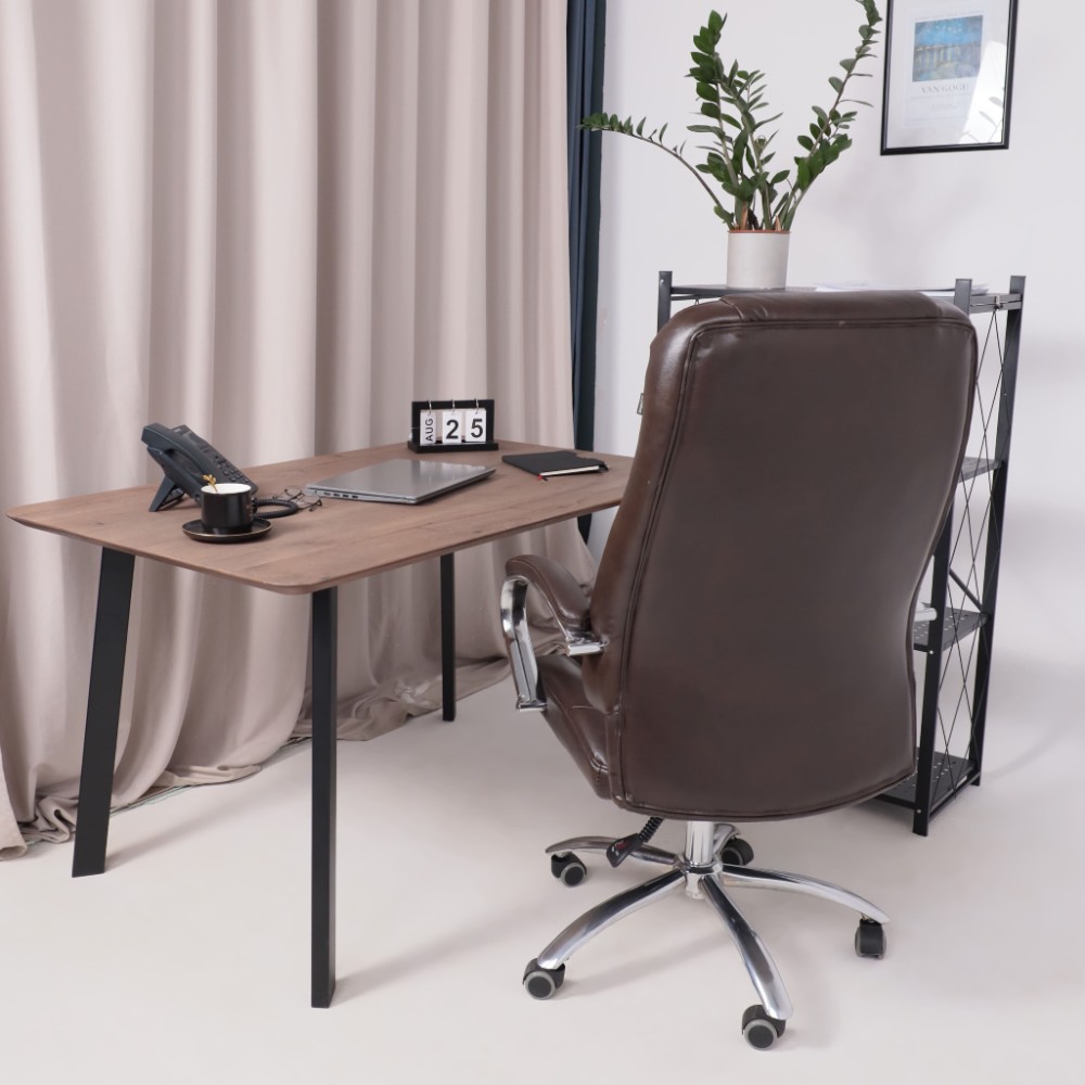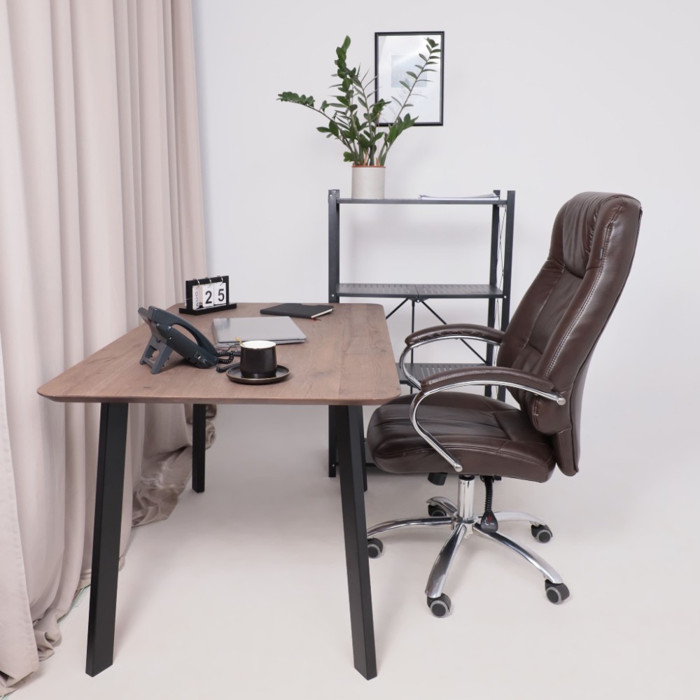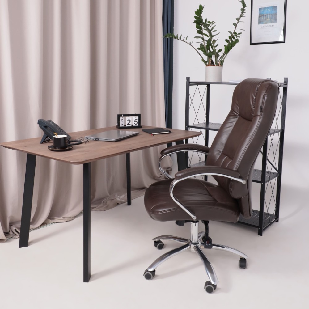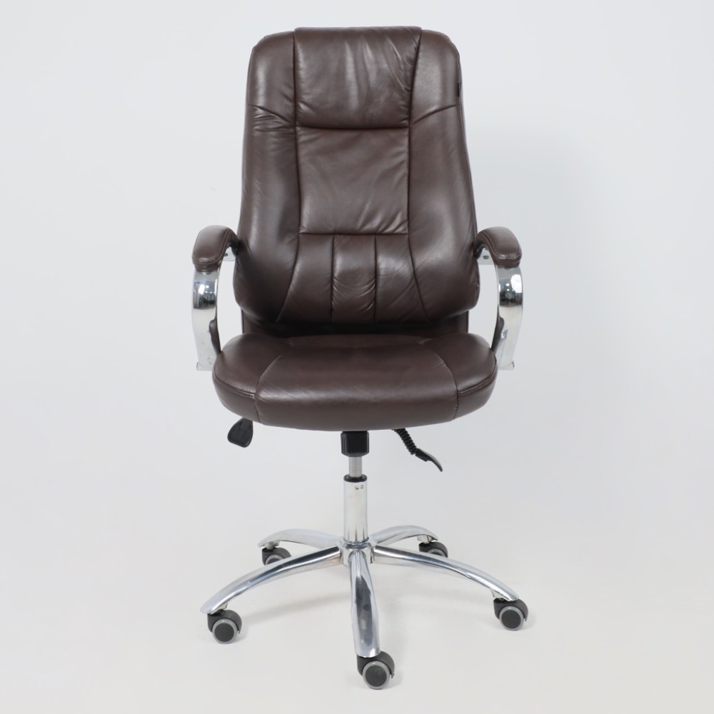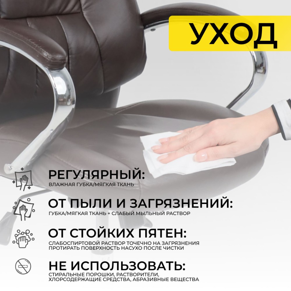 Материал презентабельно выглядит и подчеркивает статус владельца. Кресло мягкое, с увеличенной зоной подголовника и выступающими подушками, предотвращающими нагрузки на шею, спину и ноги. Высота сиденья настраивается исходя из индивидуальных параметров владельца. Модель оснащена механизмом качания Anyfix, позволяющим фиксировать угол наклона кресла в разных положениях и регулировать жесткость качания в зависимости от веса пользователя. Дополнительный комфорт обеспечивают хромированные подлокотники с мягкими накладками из кожи. Установлены газлифт 3 класса, металлическая хромированная крестовина и прорезиненные ролики. Изделие выдерживает нагрузку до 150 кг.