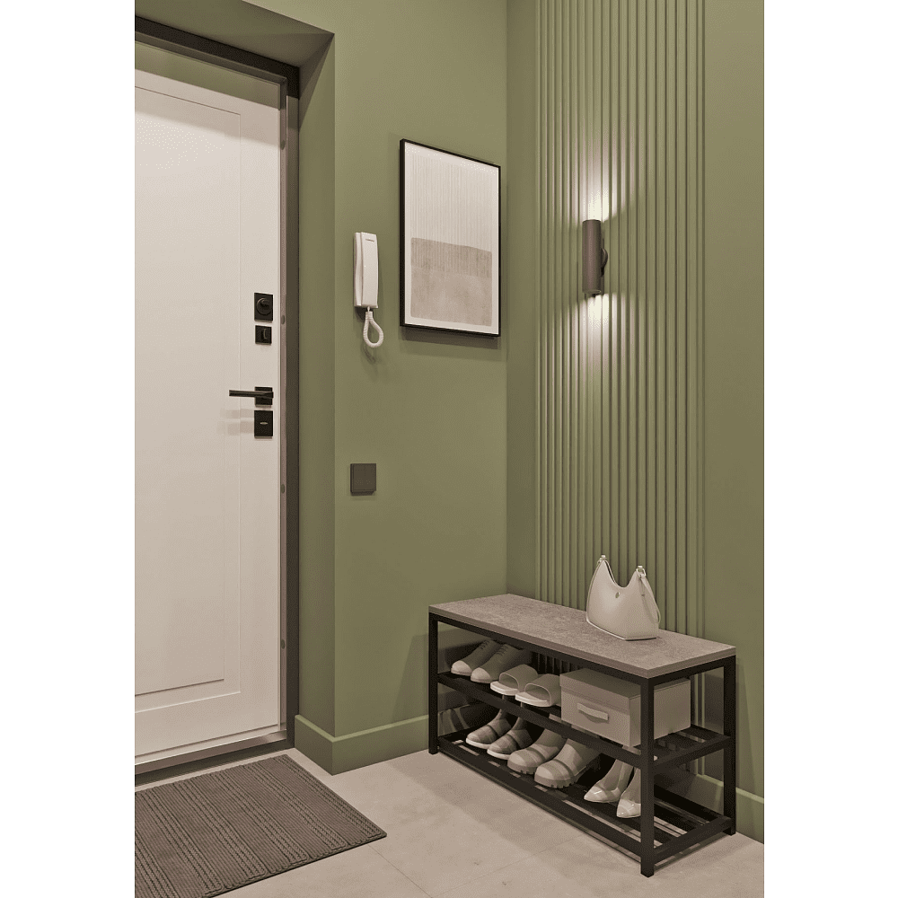 Встроенные полки вмещают до 8 пар обуви. Обувь будет аккуратно уложена, а благодаря интегрированному сидению из высококачественного ЛДСП толщиной 18 мм, всегда есть место, чтобы сесть и удобно надеть обувь. Каркас выполнен из сварного стального профиля 20×20 мм с качественным полимерным покрытием.