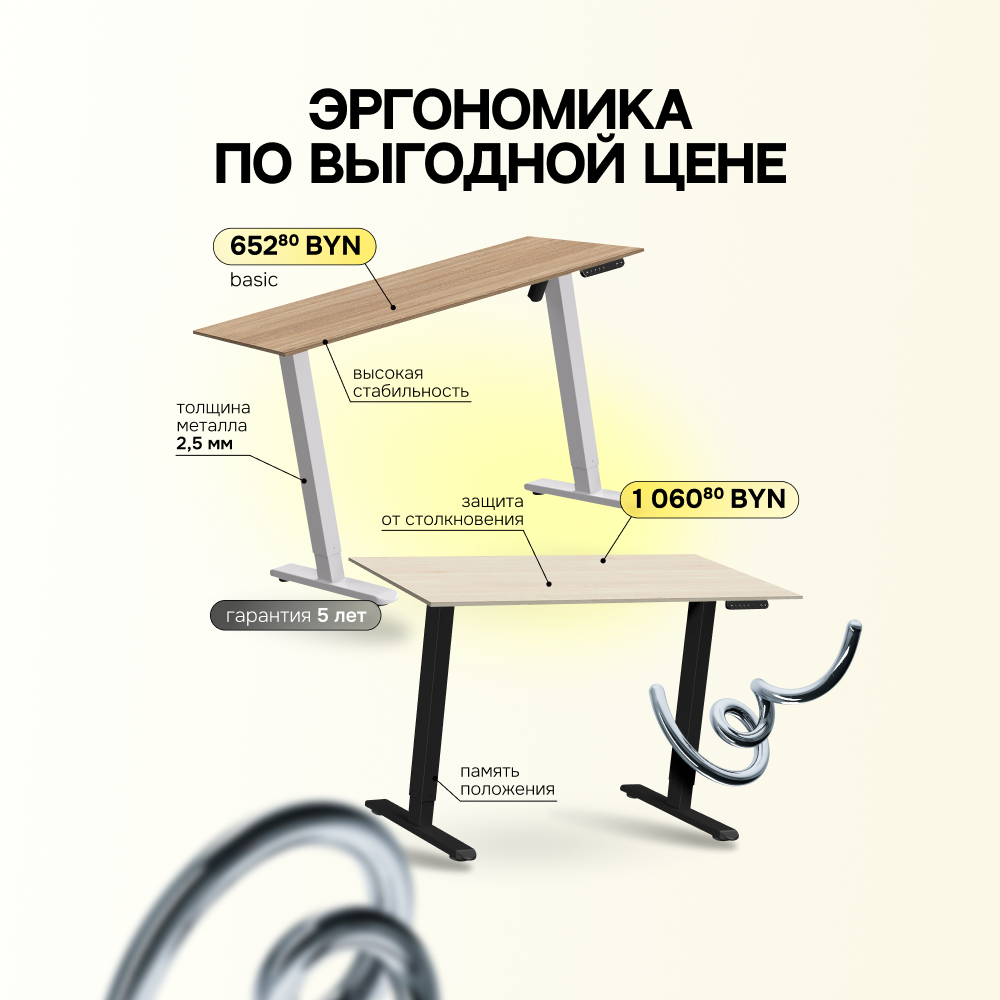 Эргономичные каркасы Basic и Prime — это регулируемые по высоте металлические рамы для столов «сидя–стоя» по выгодной цене. Обе модели оснащены двухмоторным приводом для плавного, тихого и стабильного подъёма, имеют лоток для проводов, функцию памяти положений («сидя»/«стоя»), защиту от столкновения и рассчитаны на долгий срок службы с гарантией 5 лет. Толщина металла в колоннах достигает 2.5 мм, что обеспечивает высокую стабильность даже при максимальной нагрузке.
